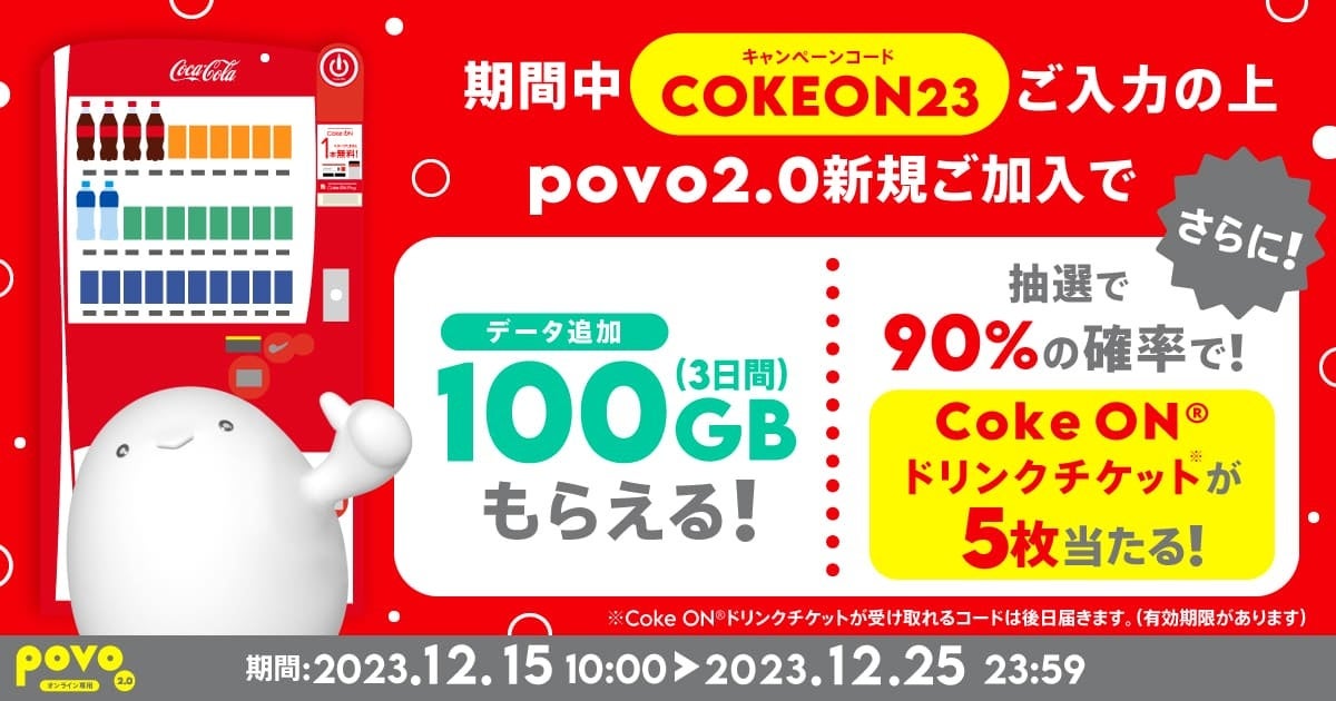 キャンペーンコード「COKEON23」を入力のうえ、povo2.0に新規加入(SIMの有効化)をいただくと、「100GB(3日間)」をプレゼントします。さらに、90%の確率(注)で「Coke ON®ドリンクチケット」5枚(お好きなコカ・コーラ社製品5本)があたります。チケットは当選者へのみ、2023年12月29日ごろにメールで送付予定です。なお、新規契約も他社からの乗り換えのお客さまも対象です。
