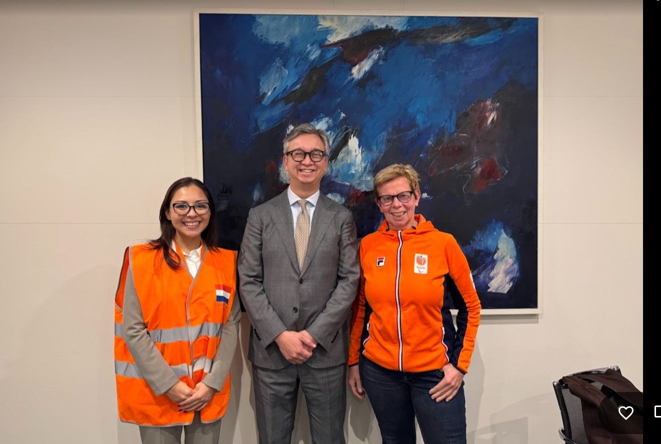 帰国後、当クラブは11月18日にオランダ大使館を訪問し、ロブ・アンデルセン副大使(大使補佐)リタ・ファン・ドリエル氏(元国際パラリンピック委員会理事)の両氏に視察内容を報告。アンデルセン氏からは、「オランダと日本は共に水害を繰り返し経験してきた。水泳が外交の手段になるという発想は興味深い。協力したい」、リタ氏からは、「安全水泳を日本で再定義する取り組みは非常に意義深く、必ず意味のある変化につながる」とコメントをいただき、“安全教育を軸にした日蘭連携”の水泳外交の可能性が示されました。