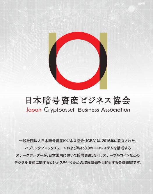 一般社団法人日本暗号資産ビジネス協会 (JCBA)は、2016年に設立された、パブリックブロックチェーンおよびWeb3.0のエコシステムを構成するステークホルダーが、日本国内において暗号資産、NFT、ステーブルコインなどのデジタル資産に関するビジネスを行うための環境整備を目的とする会員組織です。