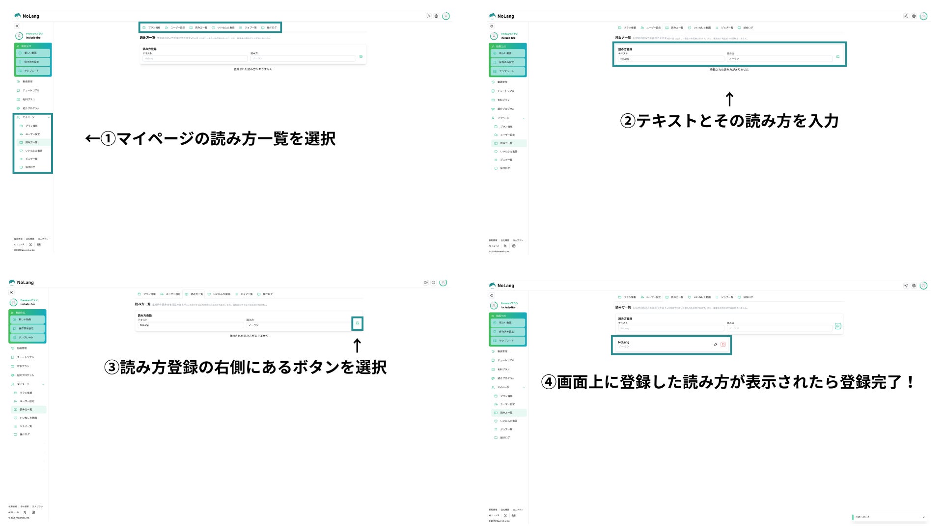 日本発、動画生成AI「NoLang(ノーラン)」を提供する株式会社Mavericks(本社:東京都文京区、代表者:奥野 将太)は、動画生成AI「NoLang」に新機能「辞書機能」を追加したことをお知らせします。本機能は、製品名や専門用語、経営者名など、AIが誤読しがちな企業独自の固有名詞の「正しい読み方」を一度登録するだけで、AIが正確な発音を学習し、それ以降AIが動画を生成する際、登録された固有名詞や専門用語を正しい発音で読み上げます。法人プランにおいては、その辞書データを社内で共有することが可能です。