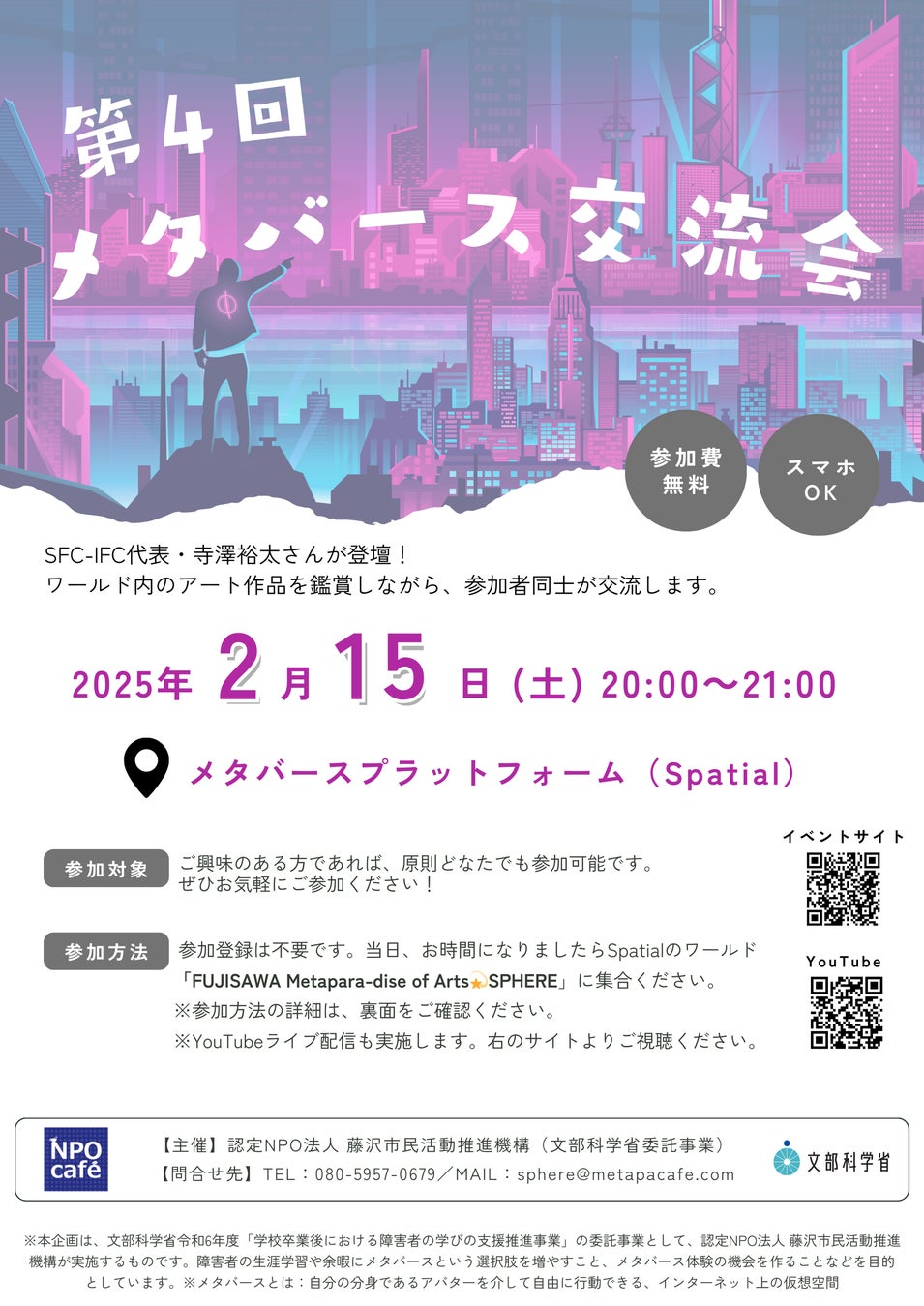 本事業は、文部科学省の令和6年度「学校卒業後における障害者の学びの支援推進事業」の委託事業として、認定NPO法人藤沢市民活動推進機構が実施するものです。障害者の生涯学習や余暇にメタバースという新たな選択肢を提供し、高校卒業前からの学びに取り入れることや、メタバース体験の機会を創出することを目的としています