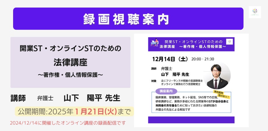 <事後レポート>言語聴覚士(ST)向け講座『開業ST・オンラインSTのための法律講座 ~著作権・個人情報保護~』をオンラインにて開催(2024/12/14)