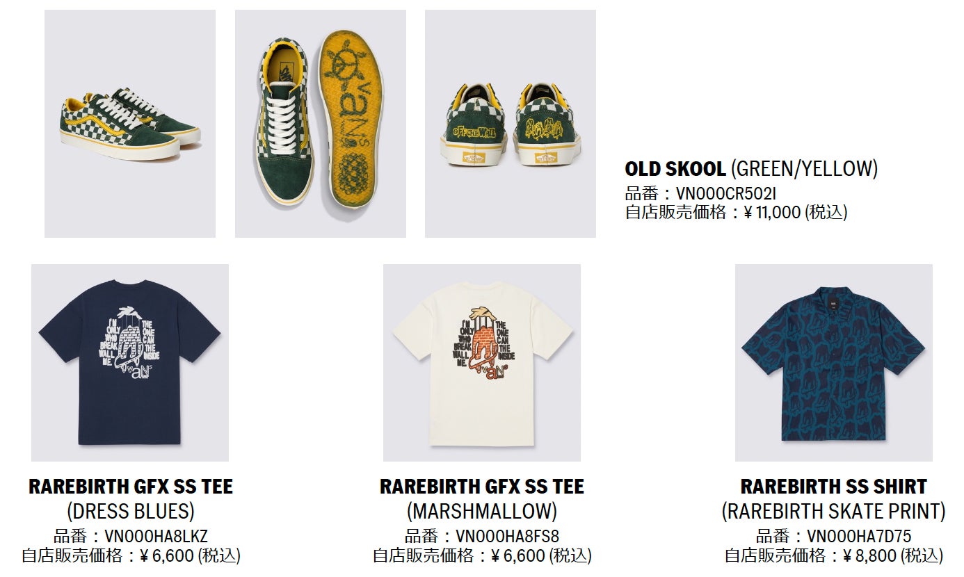 今回のコレクションでRarebirthは、スケートボーダーのタフなメンタリティにインスパイアされ、「⾃分の中の壁を壊せるのは⾃分だけだ」というキーモチーフを持つ屈強なキャラクター「Deckman (デックマン)」を⽣み出しました。ヒールカウンターに「Off TheWall」と「Deckman」の刺繍をあしらった、VANSのアイコニックなチェッカーボード柄をまとったOLD SKOOLを発表。アパレルには、彼のデザインを表現したグラフィックTシャツやシャツなどがラインアップ。