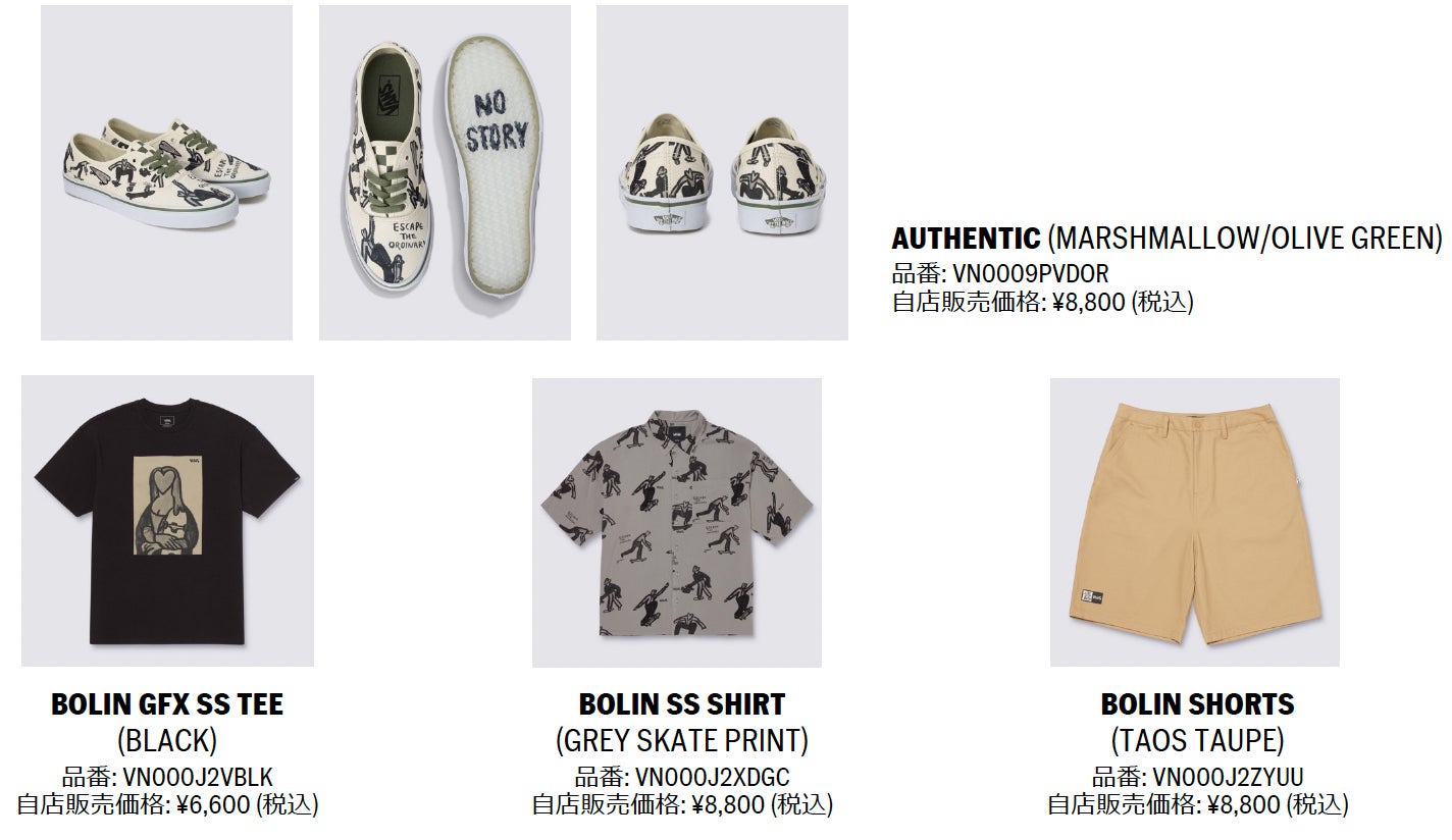 今回コレクションでBolinが表現したストーリーは「日常からの脱出」。ハート型の頭部を持つスケーターたちが、リスクを冒してでもストリートでスケートするシーンをAUTHENTICに落とし込み、彼の特徴である水彩画のスタイルを際立たせるようにオフホワイトのアッパーを採用。アパレルはアースカラーを基調とし、グラフィックTシャツ、シャツ、ニットショーツなどが登場します。