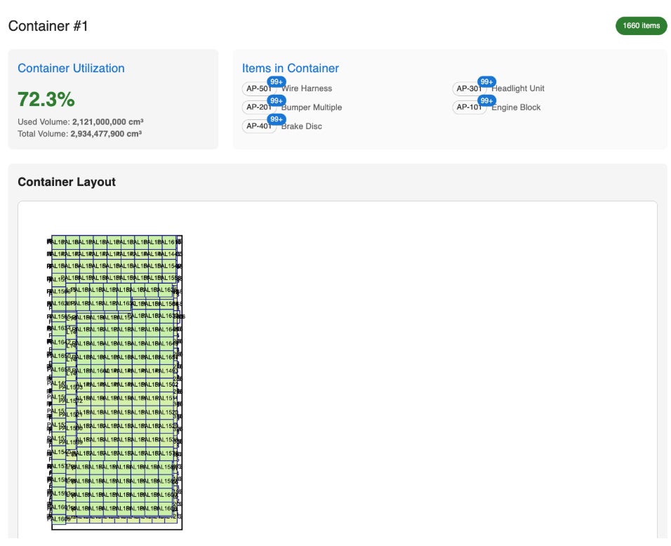 「使用コンテナ数の最小化」を最優先目標とし、膨大な積載パターンの中から最適な配置を計算します。
