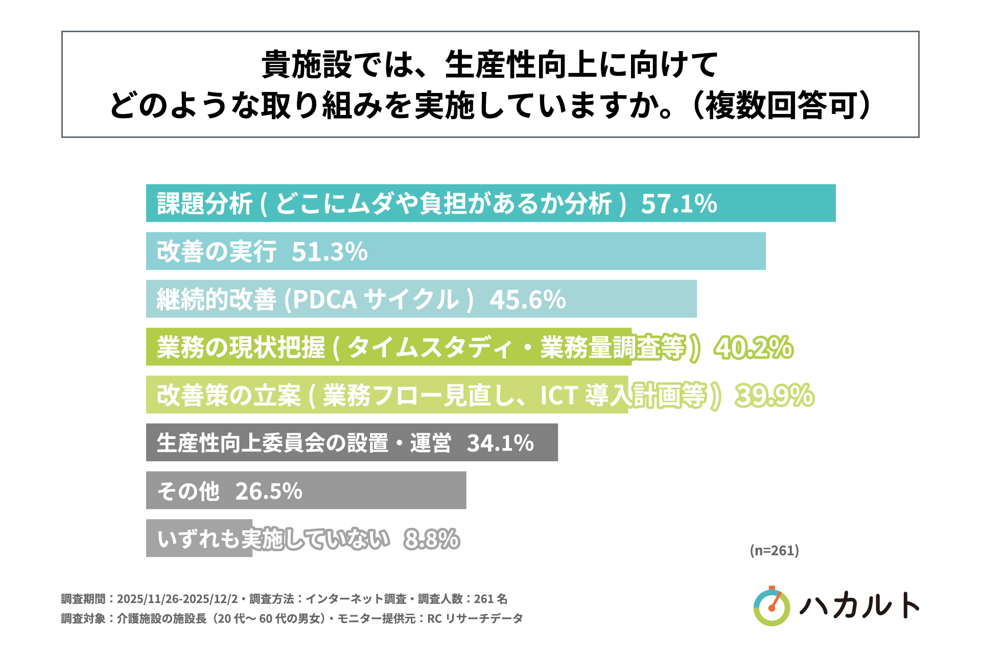 慢性的な人手不足が深刻化する介護業界において、業務効率化や「生産性向上」への取り組みは急務となっています。しかし、現場では改善の第一歩となる業務の現状把握において、リソースやノウハウ不足が大きな障壁となっており、客観的なデータに基づいた改善活動が十分に進んでいない現状があると考えられます。実際には、現場で労働環境の改善などの取り組みがどの程度行われているか、その実態はあまり明らかになっていません。そこで「ハカルト」は、介護施設における生産性向上の取り組み状況や、業務量調査の実態と課題を明らかにするため、調査を実施しました。