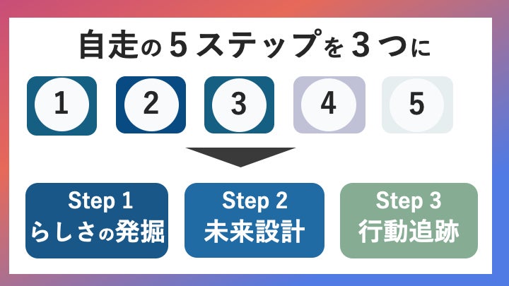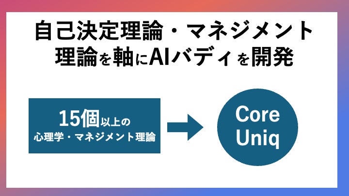 多くの企業で聞かれる「若手の成長実感が低い」「育成が個人のスキルに依存し再現できない」といった構造的な課題に対し、Core UniqはAIバディが伴走します。15以上の心理学やマネジメント理論に基づいた「らしさの発掘」「未来設計」「行動追跡」の3ステップを通じて、個々人が納得感を持ちながら自信を育み、主体的に行動変容を促す仕組みを構築。