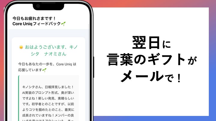 株式会社Givin' Backが提供する「Core Uniq(コアユニーク)」は、代表自身の原体験と「再現性高く人を育てたい」という強い想いから生まれた、”自分らしさ”を起点にメンバーの自律的な成長を支援するプラットフォームです。