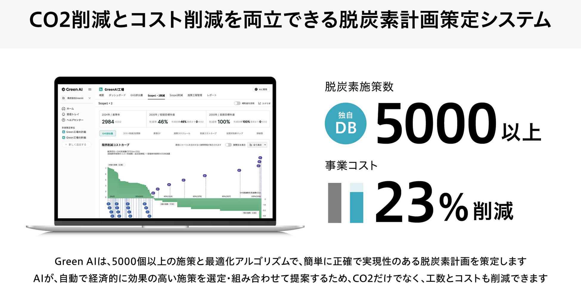 脱炭素ロードマップ策定システム『Green AI』は、専門知識がなくても短時間で計画を立てられるシステムで、AIが5,000件(数式ありは1,800件)件以上の省エネ・脱炭素施策から最適なものを選び、CO2削減量や投資回収年数をすぐに算出することで、脱炭素とコスト削減を同時に実現します。
