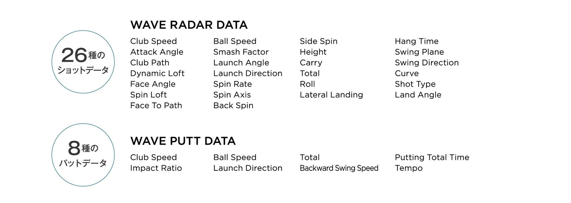 GOLFZON WAVEが計測できるデータは合計34種、ショットデータが26種、パットデータが8種で、あらゆる角度からスイングを計測します。