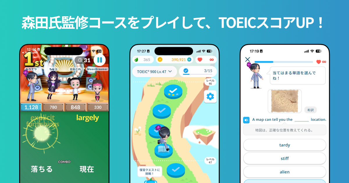 TOEIC満点120回以上のレジェンド森田鉄也が監修したTOEICコースが、楽しすぎる英単語アプリ「モチタン」で公開。楽しみながらTOEICのスコアがアップする、唯一無二の体験を提供します。