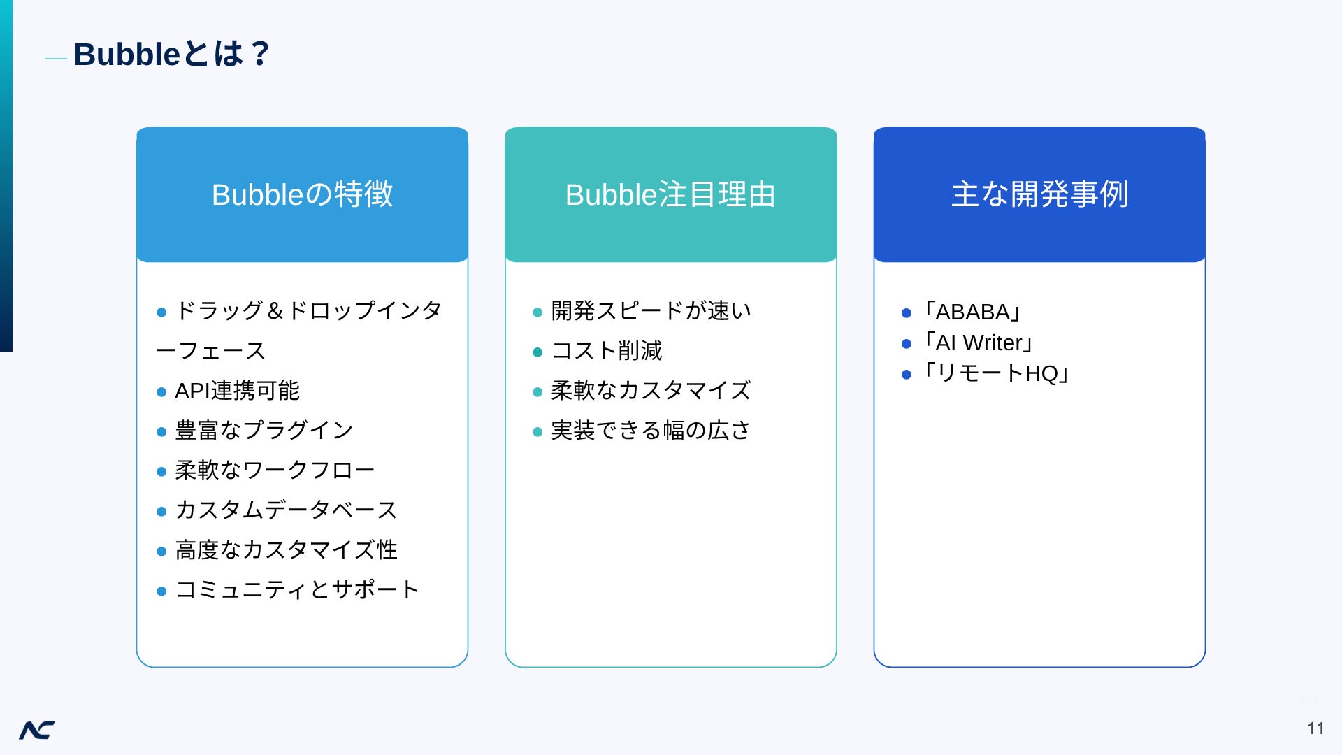 2021年よりノーコードツールBubbleを活用した受託開発を開始し、これまで40を超えるサービス開発に携わる。PM、エンジニア、Webデザイナー、Bubble講師など多角的な視点で支援し、短納期・高品質な開発を提供。