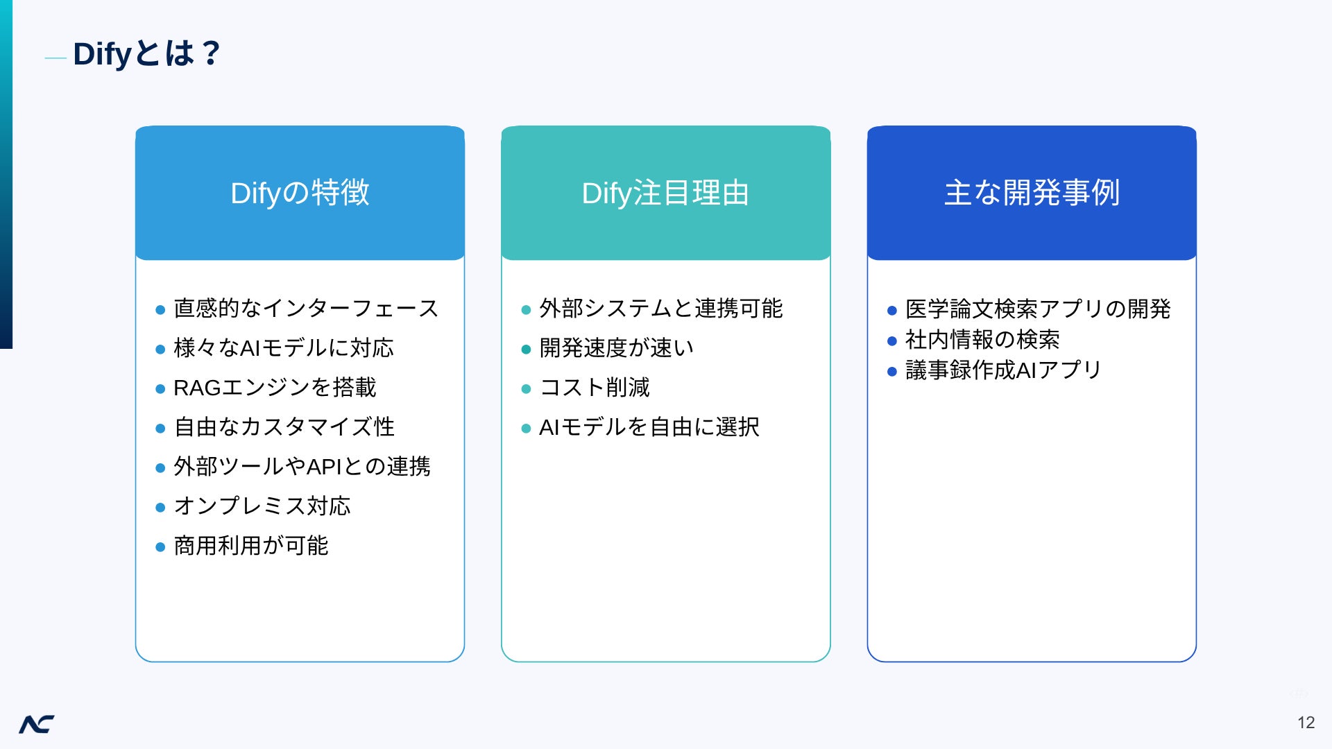 株式会社ノーコード総合研究所は、UI 部分をノーコードツール「Bubble」、AI ロジックを「Dify」で構築する開発フローでサービスを提供します。