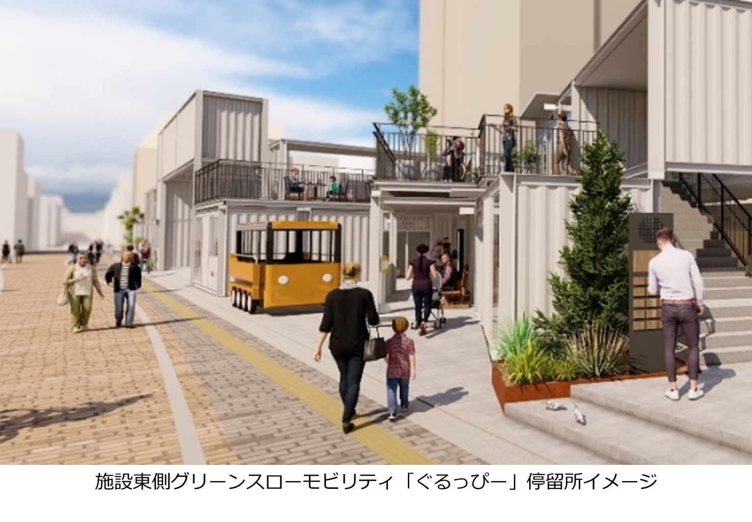 また、敷地内にはグリーンスローモビリティ「ぐるっぴー」の停留所を設け、ぐるっぴーを活⽤したウォーカブルな街づくりを促進します。