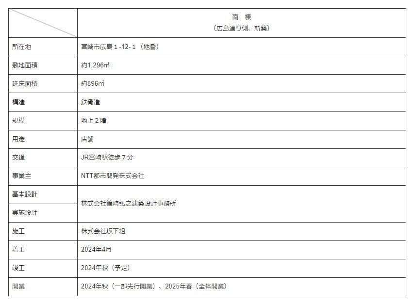 NTT都市開発株式会社(本社:東京都千代田区、代表取締役社長:辻󠄀上 広志)およびNTTアーバンソリューションズ株式会社(本社:東京都千代田区、代表取締役社長:辻󠄀上 広志)は、2022年12月23日に宮崎市及び西日本電信電話株式会社(以下、「NTT西日本」)宮崎支店と締結した「次世代型まちづくりの推進に関する連携協定」(以下、「連携協定」)に基づき、NTT西日本宮崎支店敷地(宮崎市広島1丁目12-1)にて進めております宮崎市広島一丁目プロジェクト(以下、「本計画」)について、2024年2月のNTT広島ビル北棟(高千穂通り側)リノベーション工事着工に引き続き、南棟(広島通り側)の新築工事に着手しました。なお、2024年秋に南棟の一部先行開業を行うとともに、2025年春に現在リノベーション工事中の北棟と合わせて全体開業を予定しています。