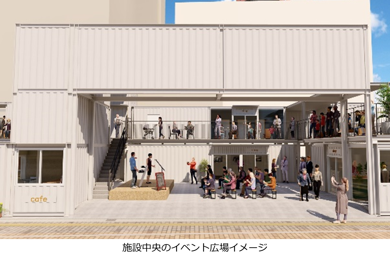 国内最大級となる建築用コンテナ34台を集積し、広島通りに沿って店舗や共用テラス等が連続的に繋がる滞留の場を設ける事で、ウォーカブルで賑わいあふれる街づくりをめざします。