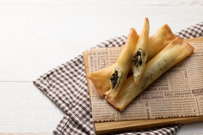 秩父名物の「しゃくしな漬」とクリームチーズを春巻きの皮で巻き、カリカリに揚げた商品です。