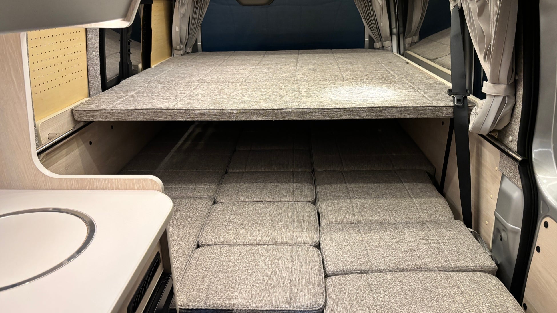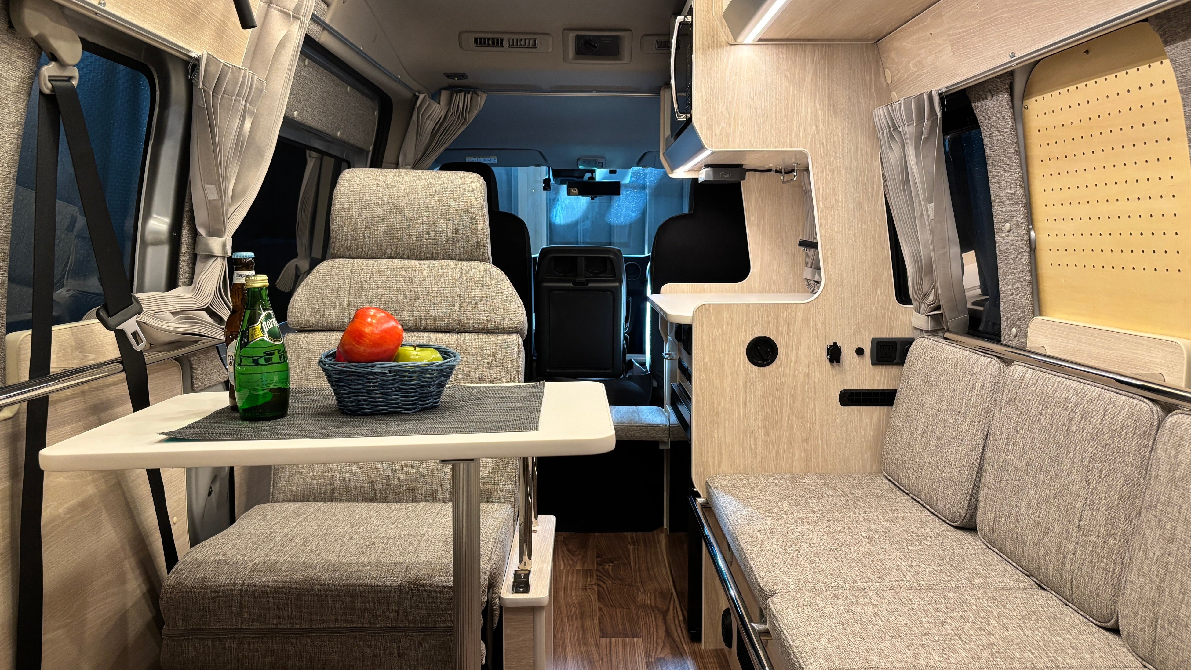 エントランス入ってすぐ右手に前向き、後向き、フラットモードになる1人掛けマルチシートが設置されています。ひじ掛けも付いて快適です。横向きの3人掛けシートは2点式シートベルト付。すべてのシートをフラットにすれば大人2人と子供1人が就寝できる広々としたスペース(長さ2300mm×最大幅1500mm)に早変わりします。マルチシートを後向きモードにすれば、サードシートと対座になるダイネットが完成。着脱式テーブルを移動させれば横向き3人と合わせて5名でテーブルを囲むことができます。