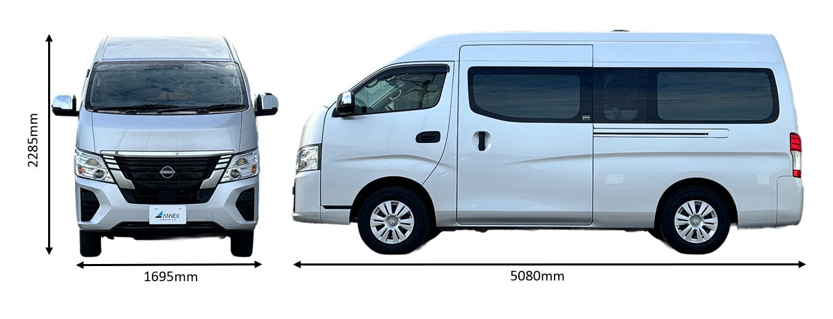 サイズ:全長5,080mm×全幅1,695mm×全高2,285mm(マックスファン装着時は2,400mm)、8ナンバー、日産キャラバンスーパーロングバンベース、燃料タンク65L