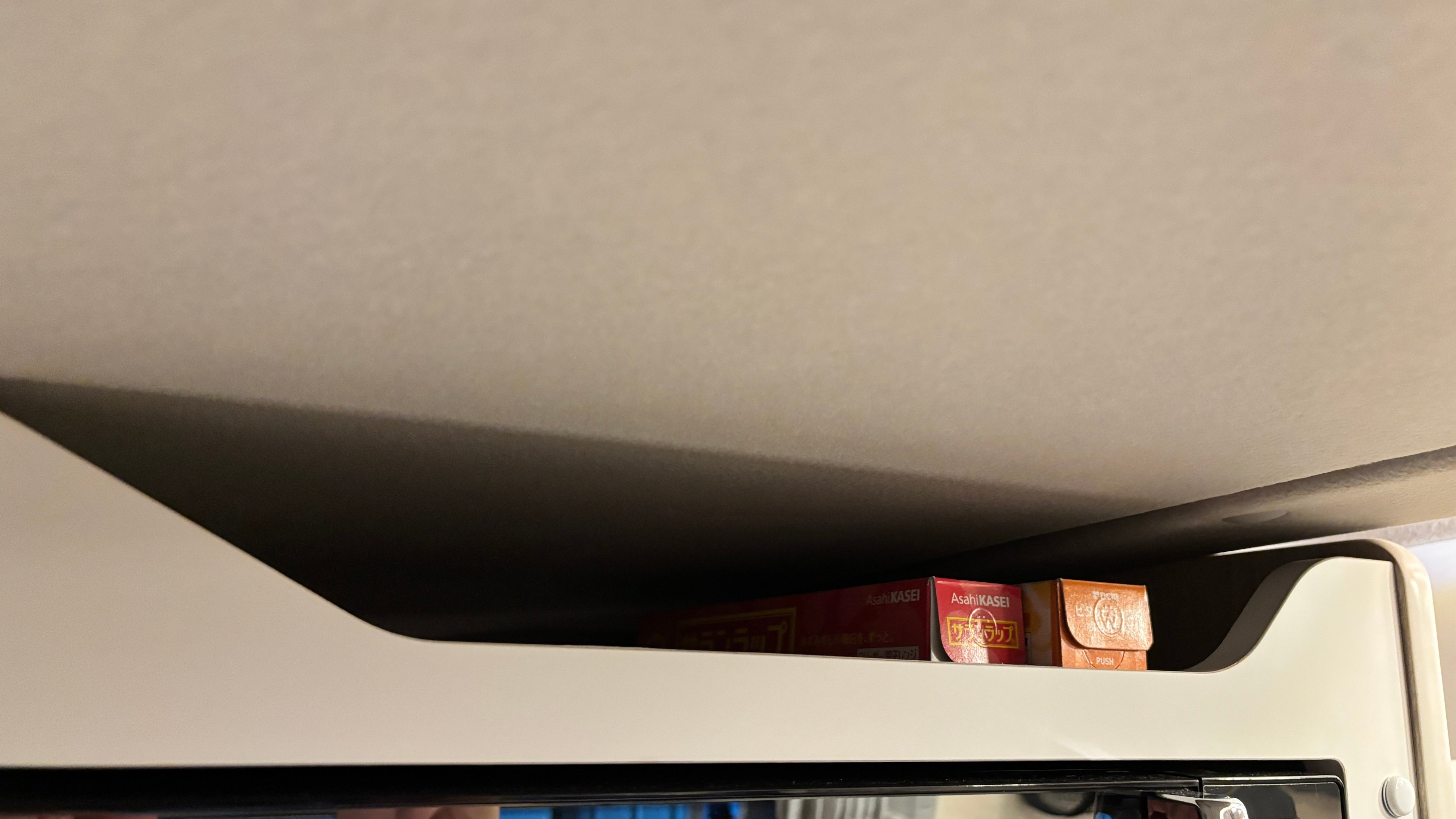 横向きシート(3人掛け)の上部には、衣類や小物をたっぷり収納できる収納棚を設置しました。
