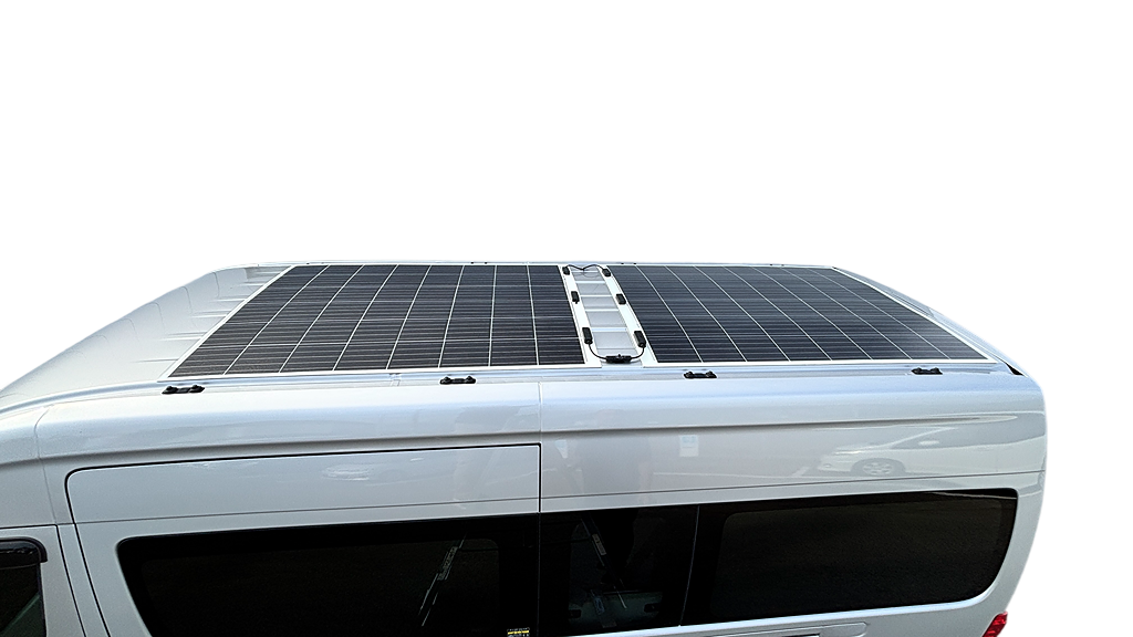 クーラーパッケージプラス2を選択すると、リチウムイオンバッテリー500Ah、インバーター3000W、12Vクーラー専用外部電源口、ポータブルバッテリー電源口、外部電源装置(50Aチャージャー)、100Vコンセント、そして、断熱加工がセットで搭載されます。また、オプションで薄型ソーラーパネル250Wを最大2枚追加することも可能です。