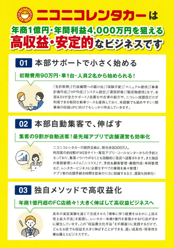 ニコニコレンタカーの既存会員は、現在全国300万人。利用客の約9割がWEBサイト・専用アプリ・コールセンターからの予約となっており、集客ノウハウがなくとも自動的に各店へ送客されます。また独自の業務管理システム「ニコラス」で、予約&顧客管理・書類作成・車両管理などのレンタカー業務を楽々管理! アプリ客の店頭手続き時間を従来の1/3に短縮するなど、運営も効率化!