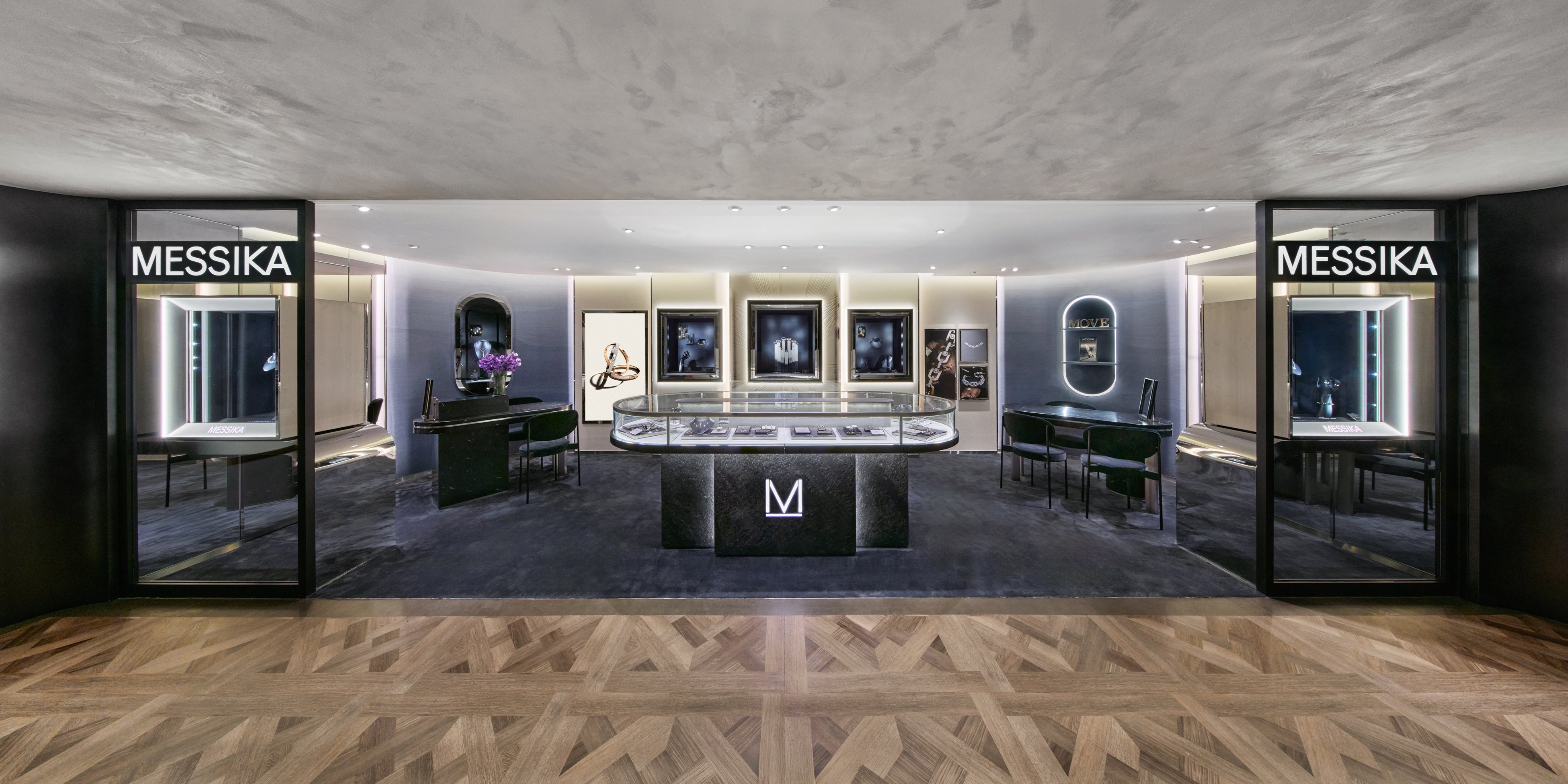 店内は、創業者でありアーティスティック ディレクターのヴァレリー・メシカの美学が随所に息づく、洗練された空間。コンテンポラリーでありながらもタイムレスなエレガンスを兼ね備えたインテリアは、ダイヤモンドの輝きを最大限に引き立て、訪れる人々をメシカの世界観へと導きます。