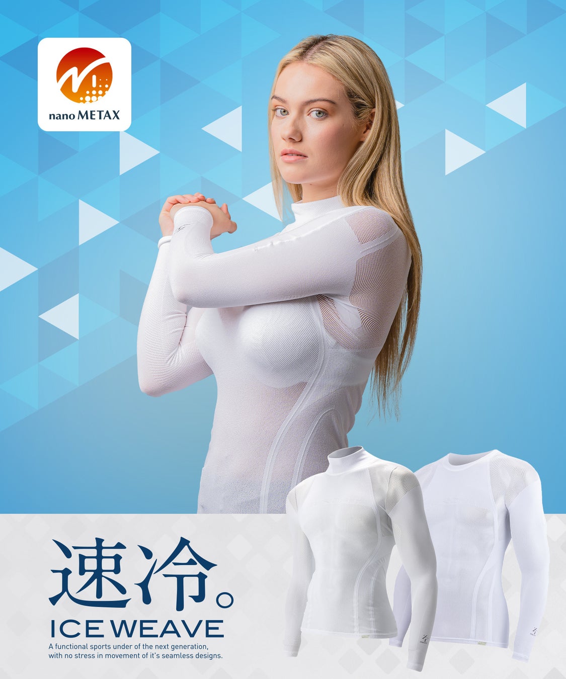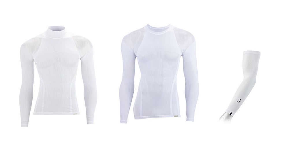 ICE WEAVEの冷感性能にファイテン社の技術を融合し、“クール&リラックス”を両立させました。酷暑シーズンを快適に楽しんでいただける一着です。暑さに挑むアスリートのパフォーマンス維持を「ICE WEAVE にナノメタックスを施したベースレイヤー(モックネック・クルーネック)、アームカバー」でサポートします。