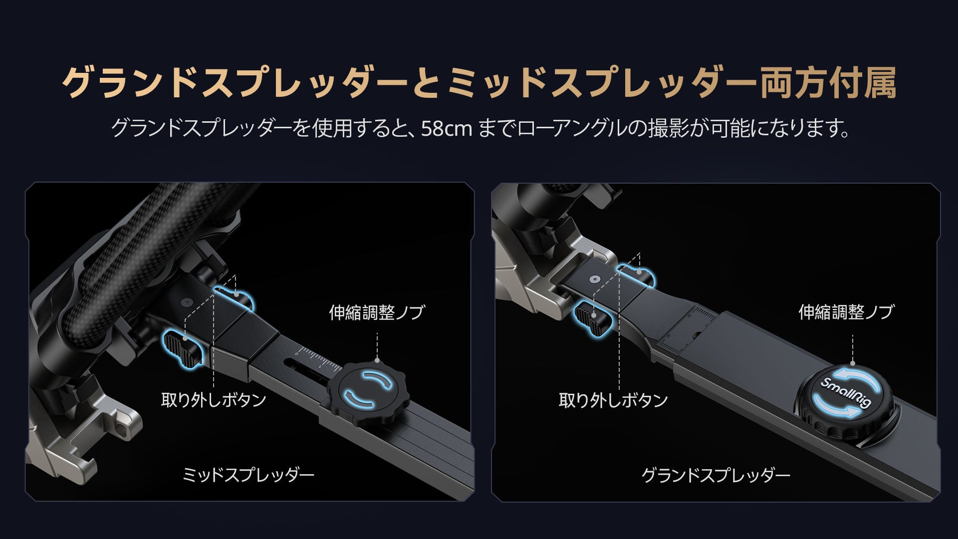 グランドスプレッダーとミッドスプレッダー両方同梱しており、より多様なニーズに対応できます。グランドスプレッダーを使用すると、58cmまでローアングルの撮影が可能になります。