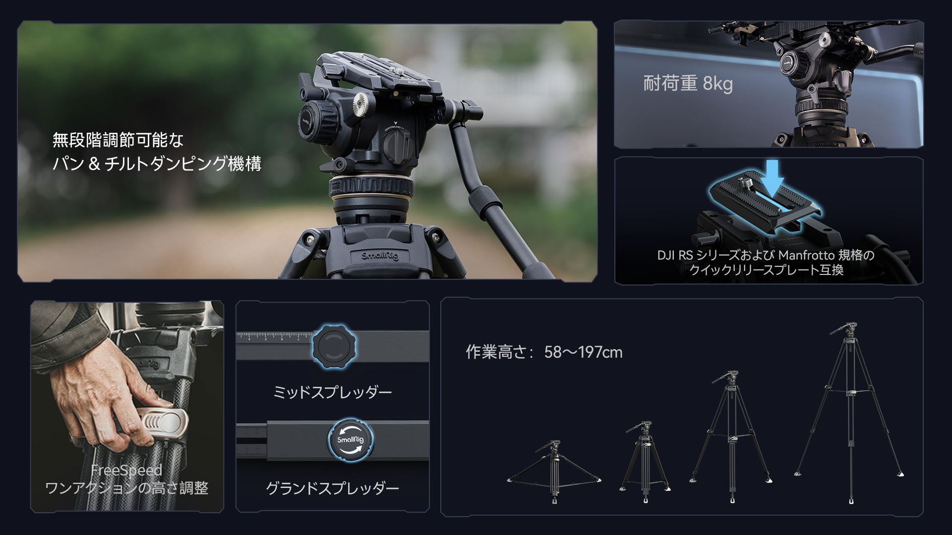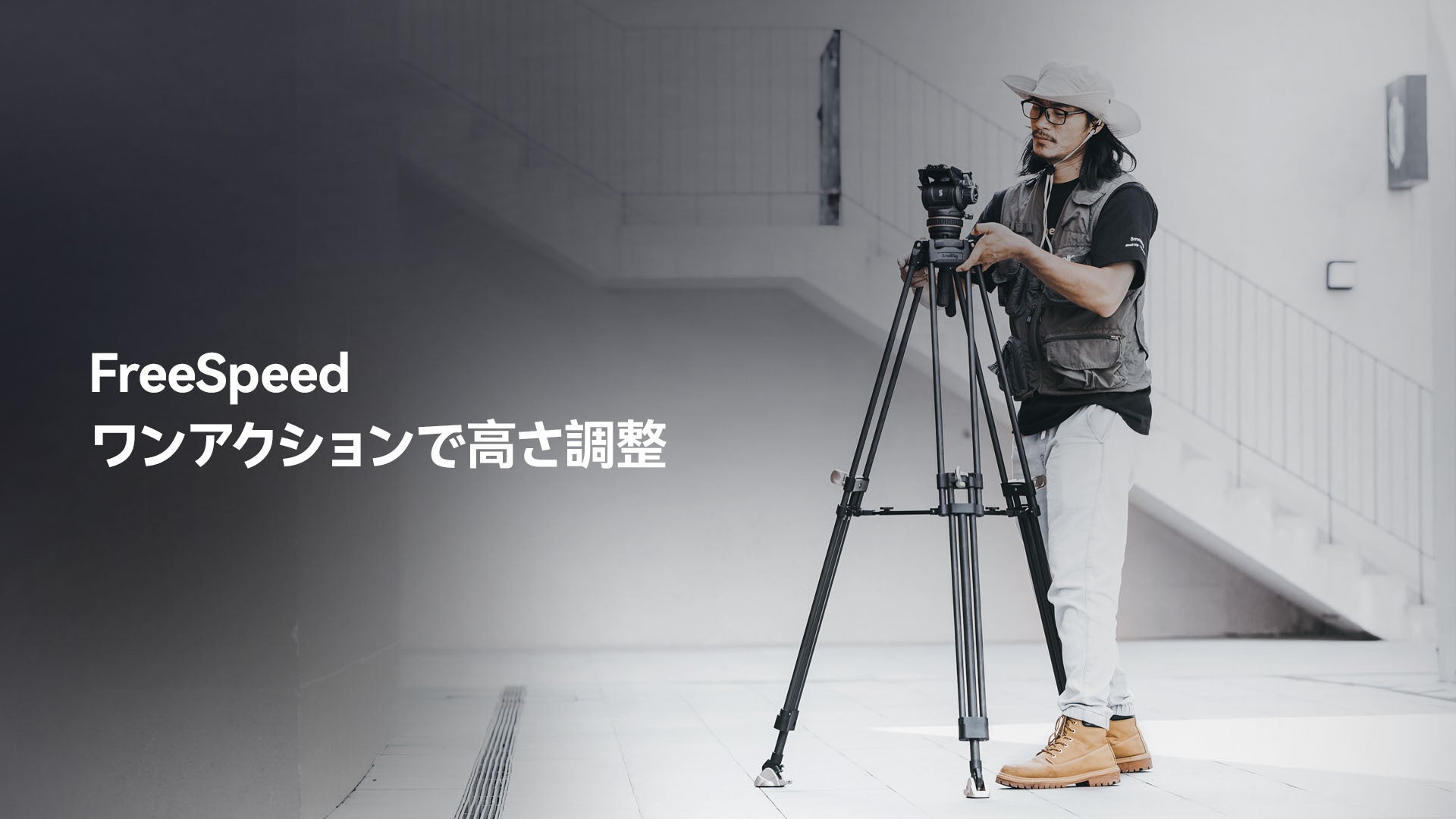 ワンクリック高さ調整できるFreeSpeed技術と高性能なビデオ雲台搭載