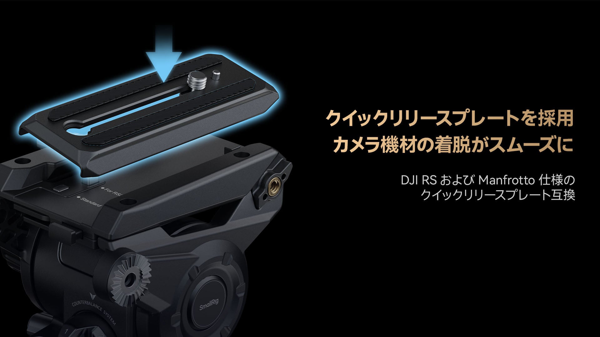 DJI RSシリーズおよびManfrotto規格のクイックリリースプレートと互換性があり、カメラ機材の着脱ががワンタッチで行うことができます。