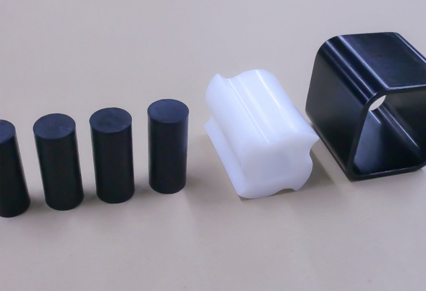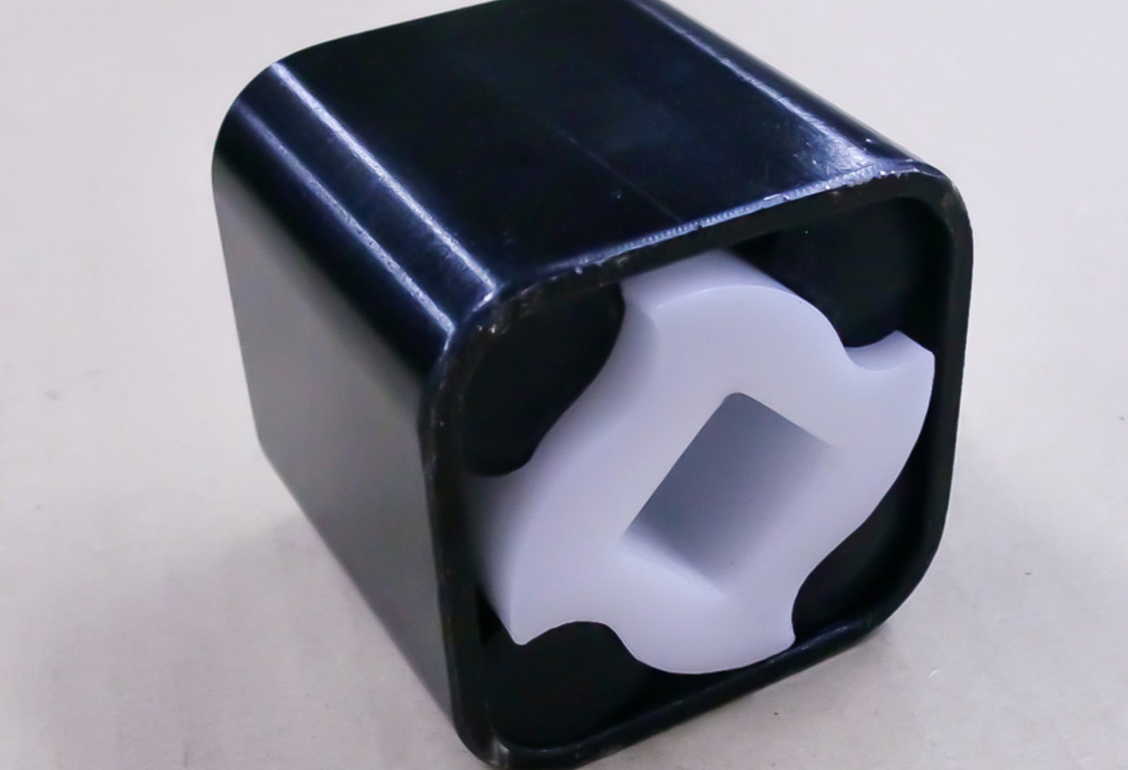 1958年に実用化。ナイトハルトゴムばねとは、主に衝撃吸収のために活用される部品です。角パイプの中に45度ずらして角材を入れ、その4隅に丸いゴム棒を圧入します。内側の角材に圧力がかかるとゴム棒が変形し、その動きが衝撃を吸収するのです。