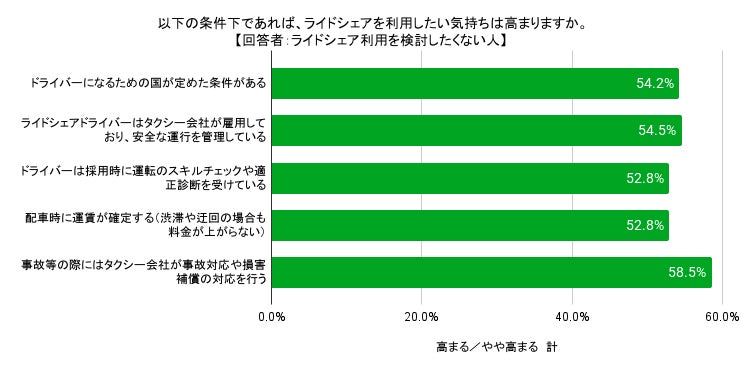 例えば「ライドシェアドライバーになるための国が定めた条件がある」「ライドシェアドライバーはタクシー会社が雇用している」などの条件下では半数以上が利用意向が高まると回答しましたが、「日本版ライドシェア」はタクシー会社の管理のもと運行することが定められており、ドライバーの管理や安全対策についてはタクシーと同等のレベルを求められており、先述の条件下での運行が実現しています。(※1 ※2)