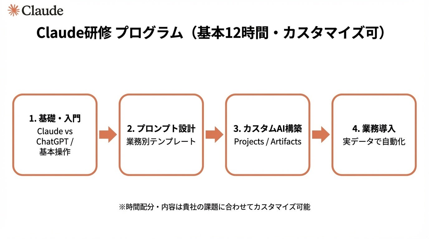 多くの企業がChatGPT研修を実施済みですが、「結局使われていない」というケースが多発しています。本研修ではClaudeの長文処理とProjects機能を活用し、ChatGPT研修では実現できなかった「定着するAI活用」を目指します。