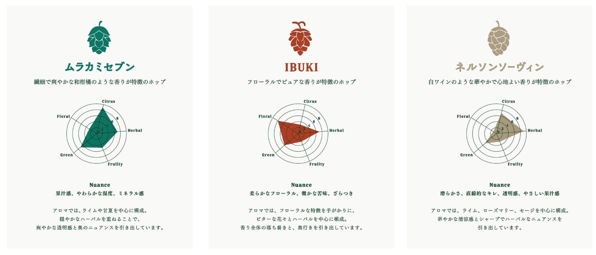「3種のホップそれぞれが固有の個性をもち、多様な表情を感じさせます。今回は『青さ・湿度・乾き・果汁感・苦味の影』という5つの方向性を設定し、ホップが植物として持つ多面的な魅力をアロマフレグランスとして昇華させました。」