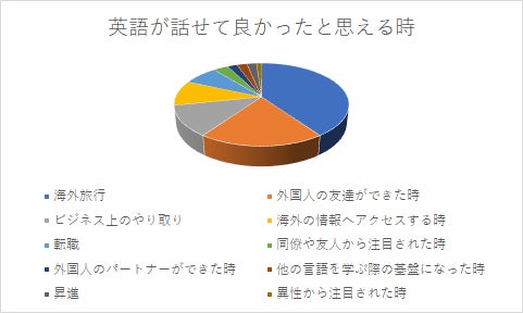 以下、「ビジネス上のやり取り」「海外の情報へアクセスする時(海外ドラマ、洋書、WEBサイトなど)」「転職」「同僚や友人から注目された時」「外国人のパートナーができた時」「他の言語を学ぶ際の基盤になった時」「昇進」「異性から注目された時」と続きます。