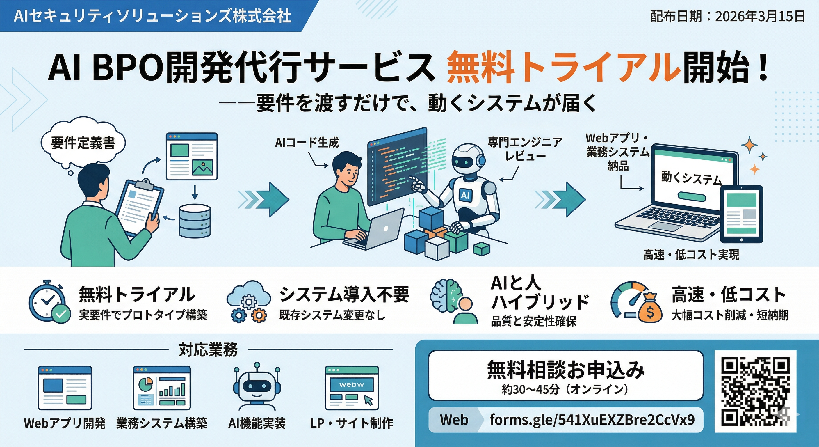 AIセキュリティソリューションズ株式会社(本社:東京都、以下当社)は、Webアプリ・業務システム・AI機能の開発業務を代行する「AI BPO開発代行サービス」について、本日より無料トライアルおよび無料相談の提供を開始しました。
