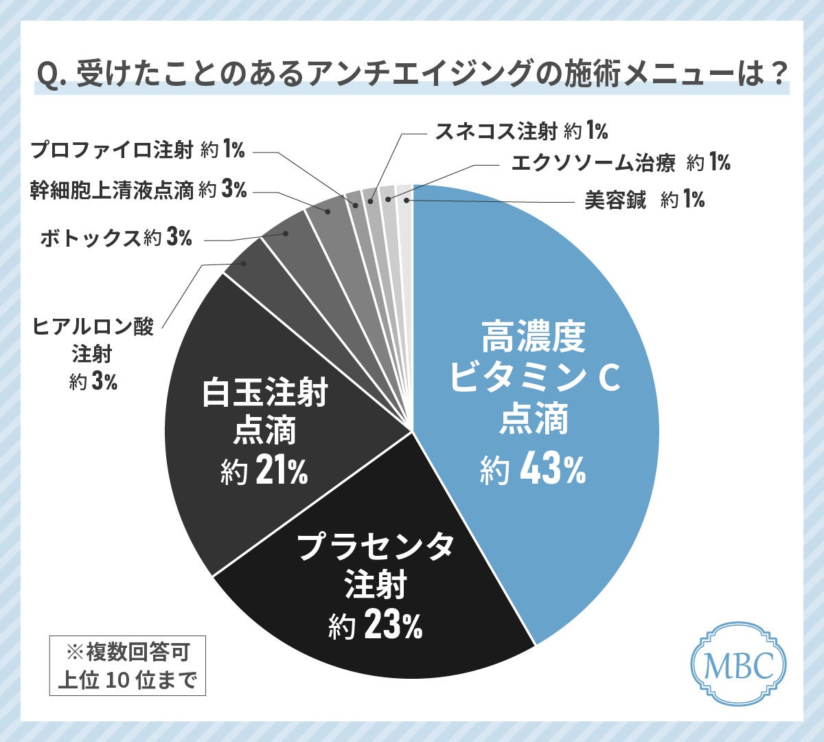「受けたことのあるアンチエイジングの施術メニューをお答えください。(選択式複数回答可)」とアンケート調査した結果、