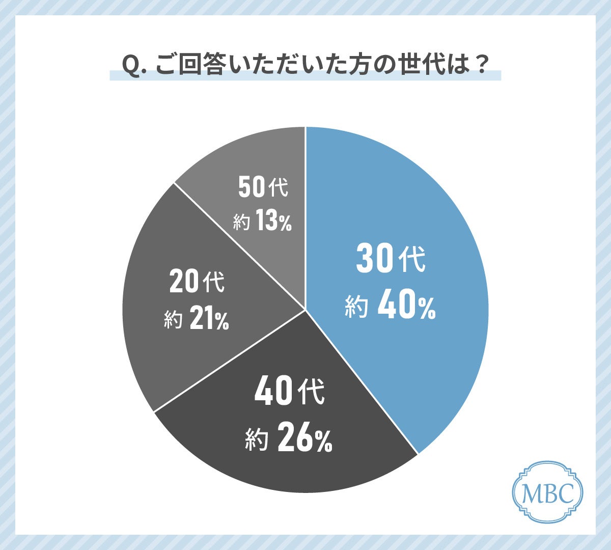 「回答者の年齢をお答えください」とアンケート調査した結果、30代(40%)、40代(26%)、20代(21%)、50代(13%)でした。