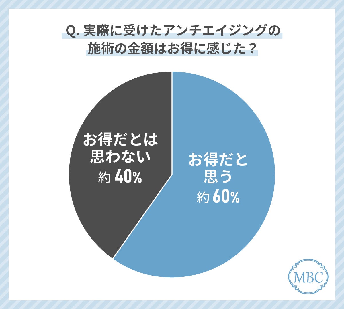 「実際に受けたアンチエイジングの施術メニューの金額に関して、お得に感じましたか?」とアンケート調査した結果、