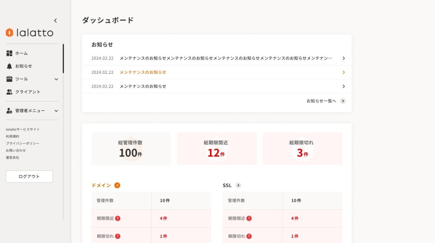 「lalatto(ららっと)」は、企業で管理しているドメインやSSL、デザインソフトなど利用サービスやツールの有効期限、支払い期限を自動的にお知らせし、うっかり更新や支払い忘れを防いでくれます。