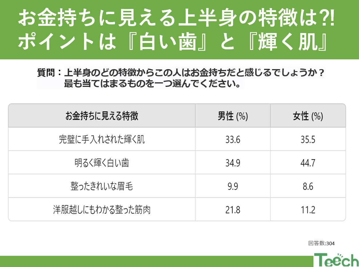 このアンケート結果から、男女ともに白い歯や輝く肌をお金持ちのサインとして感じていることが明らかになりました。しかし、男性は筋肉にも強い関心を持っており、健康的な外見が重要視されていることが分かります。一方、女性はより清潔感や美しさに重きを置いているようです。