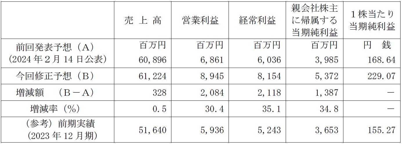 当社は、2024年11月5日開催の取締役会において、2024年2月14日に公表いたしました2024年12月期(2024年1月1日~2024年12月31日)の連結業績予想及び配当予想の修正を決定しましたので、下記のとおりお知らせいたします。