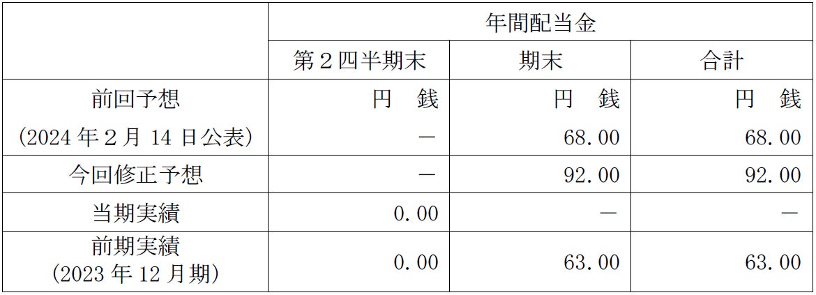 この基本方針のもと、期末配当金につきましては、2024年12月期の連結業績予想の修正の水準も踏まえ、配当予想を前回より24円増額し、1株当たり92円(配当性向40.2%)に修正いたします。