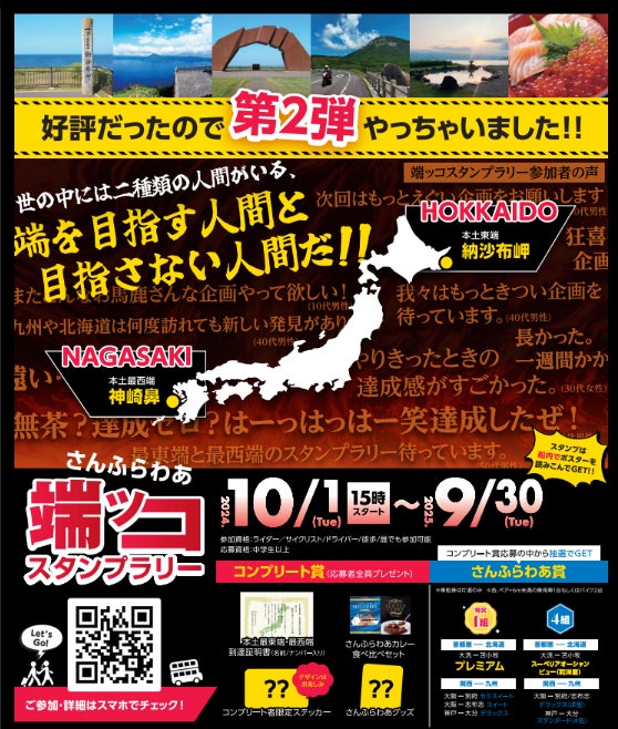 ご好評にお応えして、2024年10月より1年間「さんふらわあ端ッコスタンプラリー 第2弾」を実施します。今回は、前回同様さんふらわあの2航路を利用し、「最東端」の納沙布岬、「最西端」の神崎鼻を訪れていただく企画です。到達者には、コンプリート者しかもらえない限定ステッカーやプレゼントをお贈りするとともに、抽選で乗船券が当たるチャンスをご用意しました。日本の「端」と「端」まで直線距離にして約 2,550 ㎞。果たして、挑戦者は現れるのか!? 皆様のご参加をお待ちしています。