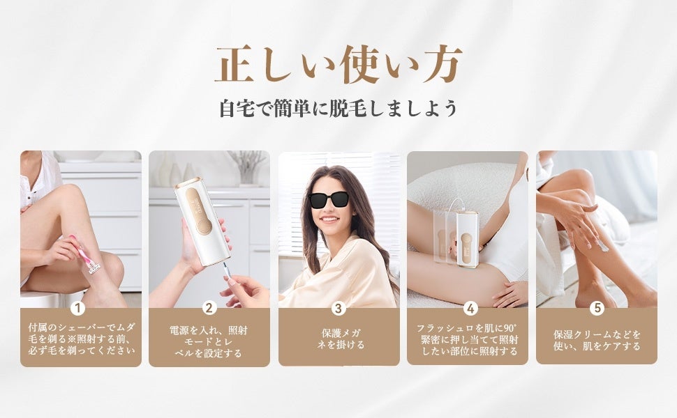 パルス光脱毛技術を採用し、波長範囲550-1200 NM、脱毛効果を保証しながら肌にダメージを与えず、自宅でサロン級IPL光脱毛を体験できます。