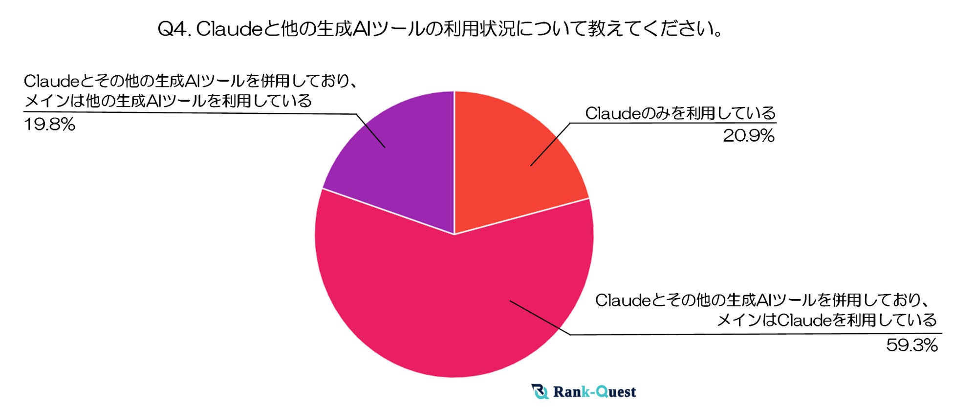 回答で最も多かったのは、「Claudeとその他の生成AIツールを併用しており、メインはClaudeを利用している」で、59.3%の回答者が選択しました。