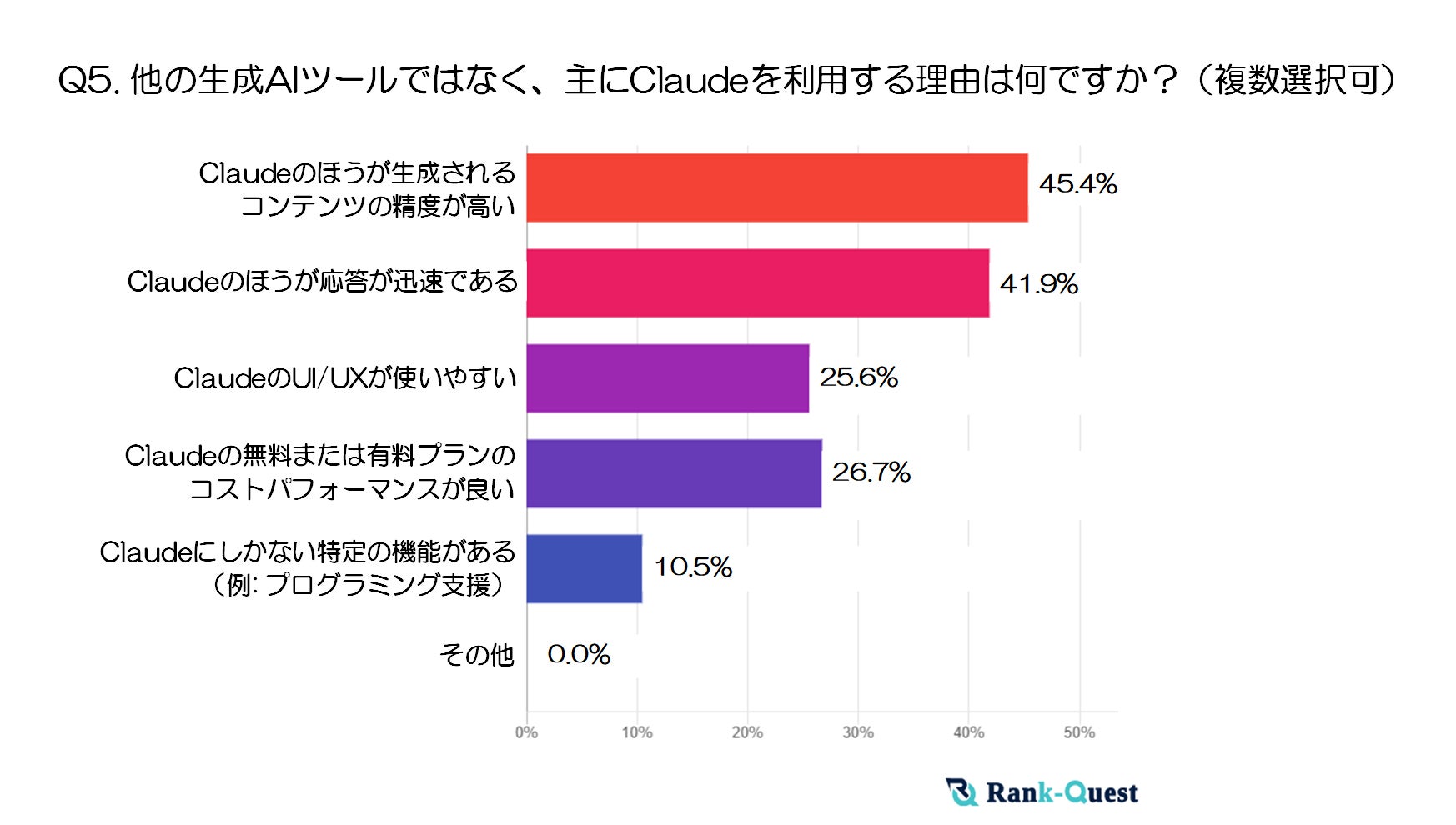 回答で最も多かったのは、「Claudeのほうが生成されるコンテンツの精度が高い」で、45.4%の回答者が選択しました。次いで、「Claudeのほうが応答が迅速である」が41.9%、「ClaudeのUI/UXが使いやすい」が25.6%と続きました。