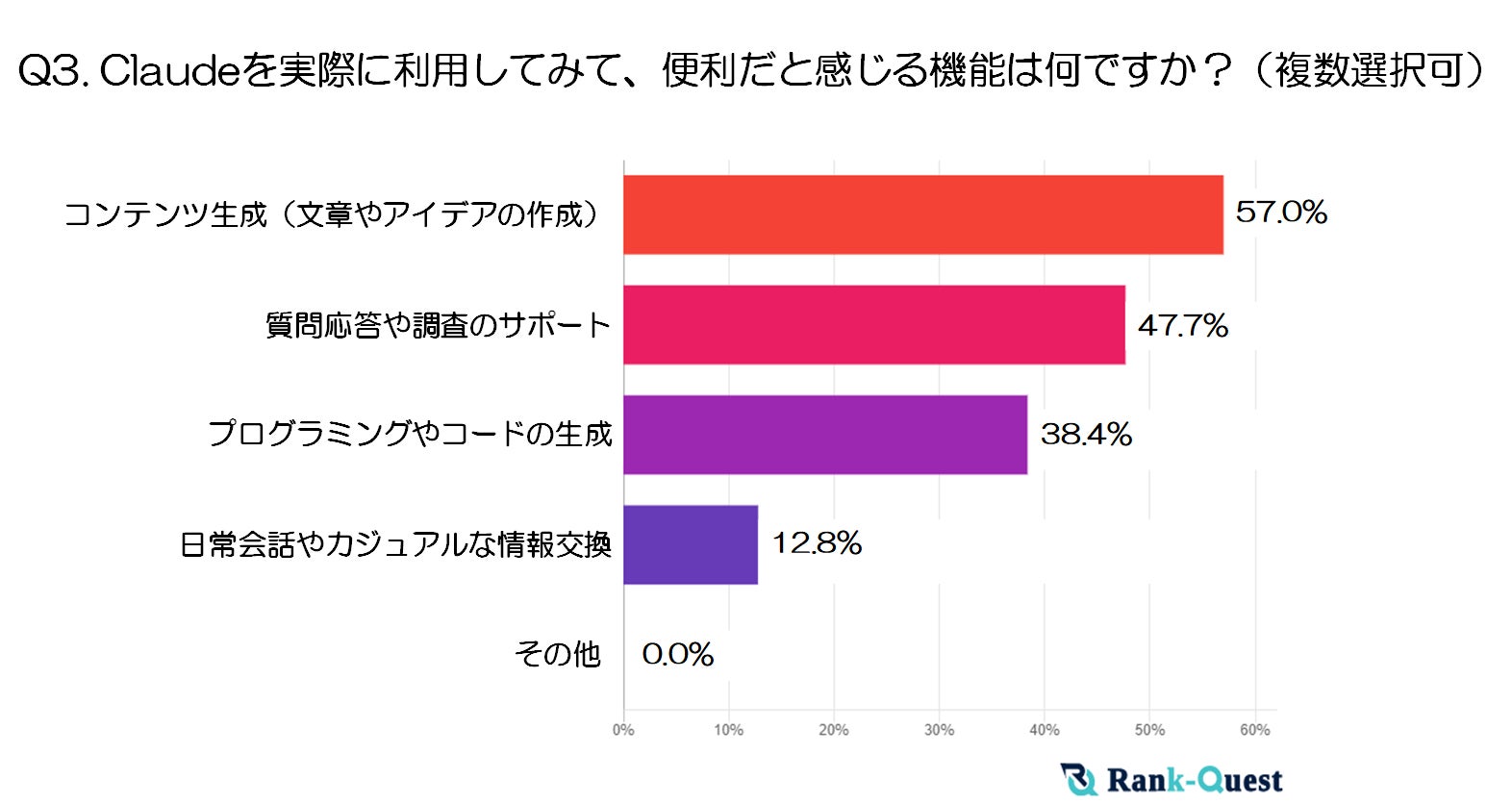 一方で、「日常会話やカジュアルな情報交換」を便利だと感じた回答は12.8%と少数派でした。この結果から、Claudeは特に業務的・専門的な用途で高く評価されていることが分かります。