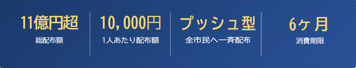本事業は、市民全員に申請不要で1人あたり10,000円分(総額11億円超)のギフトカードを直接配布する「プッシュ型」経済支援策です。現金給付では一部が貯蓄に回ってしまう課題を克服するため、使用期限(2026年9月30日)と利用先限定(市内加盟店のみ)を組み合わせることで、配布した財源が地域経済へ還流する仕組みとしています。
